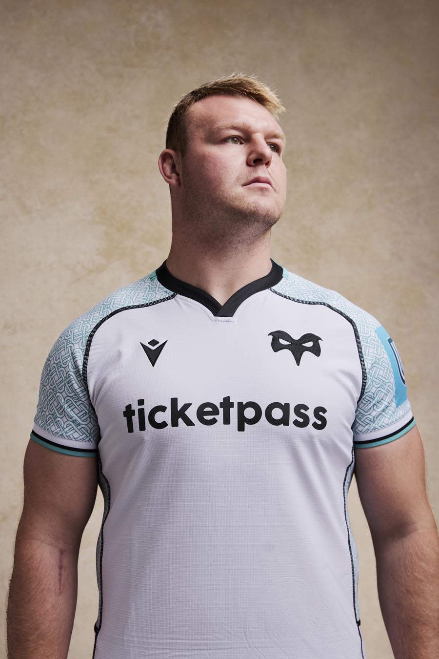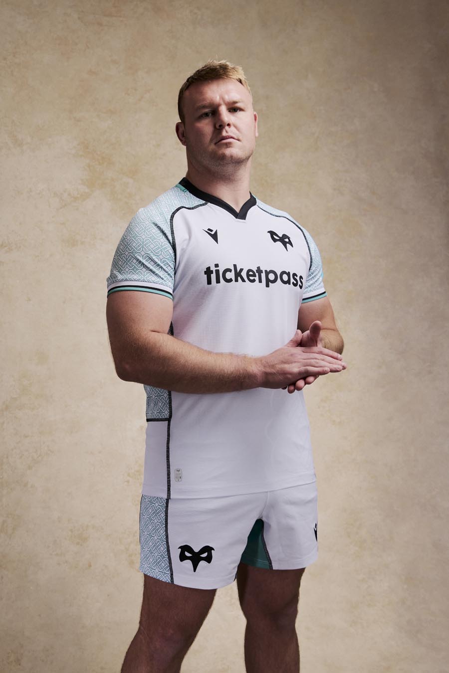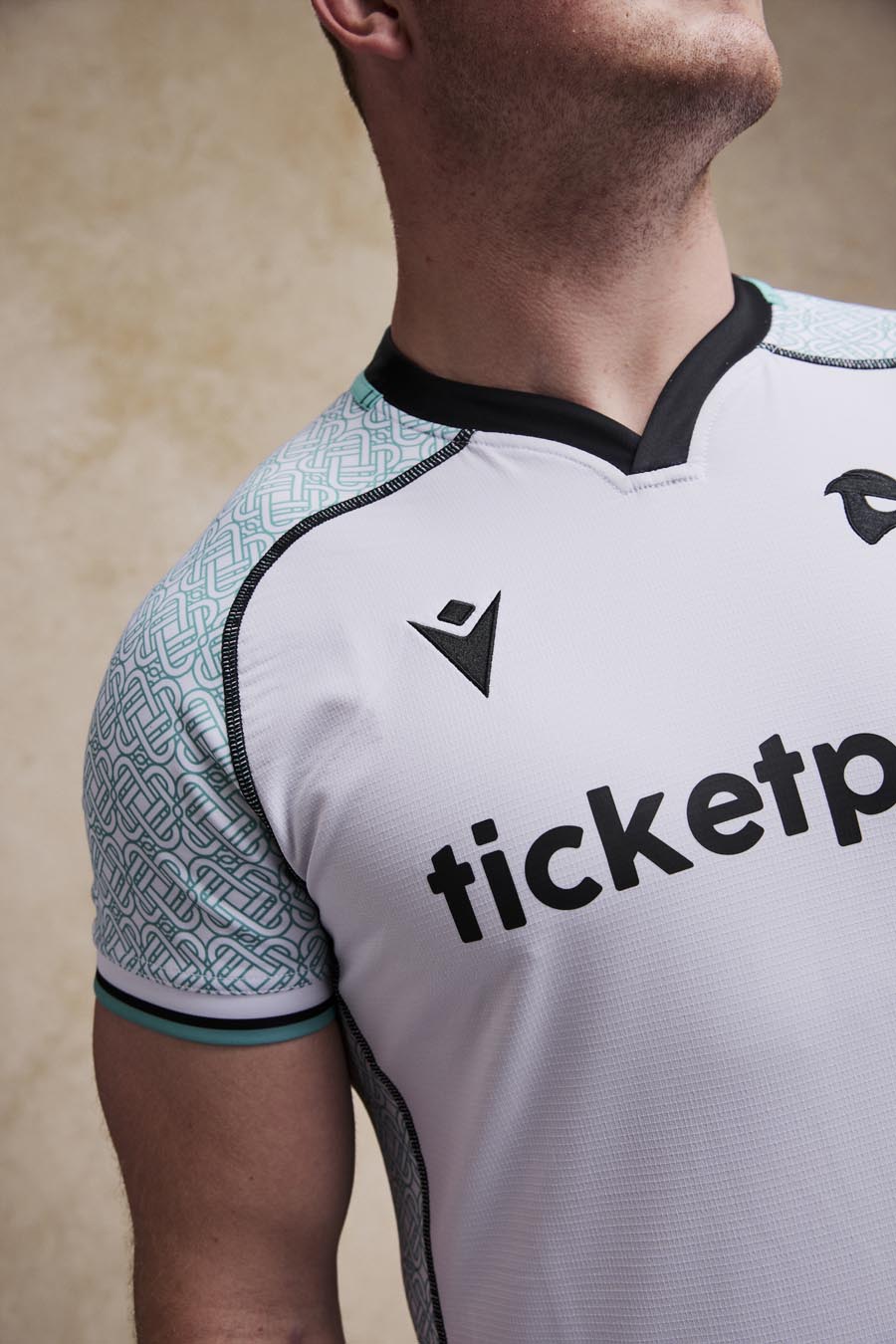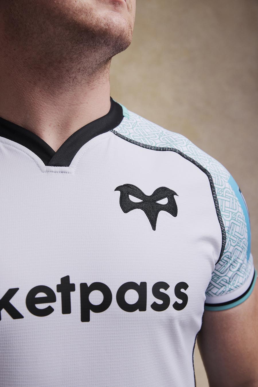 La nuova maglia Away 2025/26 degli Ospreys abbina invece il bianco al color ‘teal’, una tonalità ‘petrolio’ chiara e tendente al verde, con dettagli neri intorno al collo a V, sui bordi manica e nelle cuciture. Le spalle, le maniche e i fianchi sono arricchiti da una grafica che propone, in verde petrolio su sfondo bianco e in forma ripetuta, il disegno del nodo celtico. Si tratta di un simbolo di legame, unione, amicizia, composto da linee che si intrecciano senza inizio né fine. Lo stesso nodo è riprodotto in stampa embossata nella parte anteriore sinistra della maglia. Nel retrocollo esterno è stampato in nero lo stemma della squadra, affiancato dall’acronimo OITC – OSPREYS IN THE COMMUNITY. Si tratta di una fondazione no-profit che svolge attività a favore della comunità e che insieme al club gallese ha contribuito ad attivare una serie di programmi in tema di sport e attività fisica, salute e benessere, istruzione e occupazione. Come nella versione Home, sul fondo maglia posteriore appare infine in stampa embossata il profilo del futuro stadio del club a St. Helen’s, con all’interno lo stemma della squadra. Il kit è completato da pantaloncini bianchi con bande laterali verde petrolio che riprendono la grafica con i nodi celtici. I calzettoni bianchi hanno, poco sotto il bordo superiore, due righe orizzontali, una verde petrolio, l’altra nera.