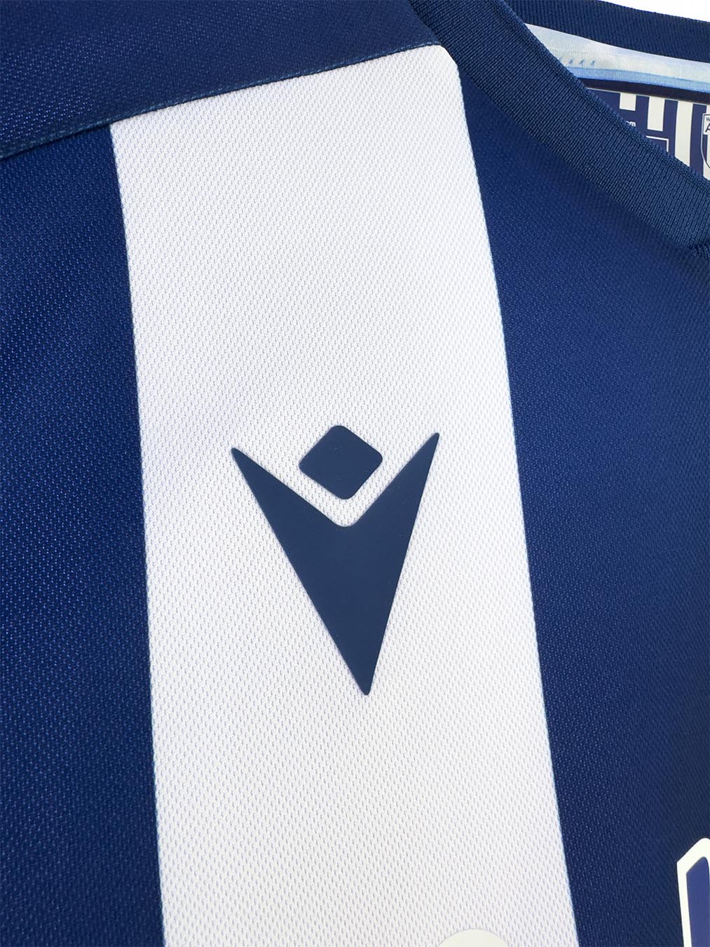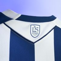 La nuova maglia Home 2025/26 del West Bromwich Albion ha un particolare collo a V in maglieria composto da una base blu navy sulla quale si sovrappone un bordo bianco solo sul lato sinistro. La maglia è nella tradizionale configurazione con bande verticali bianche e blu navy in stampa sublimata, alternanza che si ritrova anche sulle maniche. Il backneck è personalizzato con i colori e il logo del club, il logo Macron e la scritta ‘Designed in Bologna’, a certificare ed evidenziare come ogni capo sia ideato, progettato e sviluppato nel Macron Campus, sede del brand italiano. Su petto, a destra, in stampa siliconata blu navy, il Macron Hero, a sinistra la patch con lo stemma del WBA.