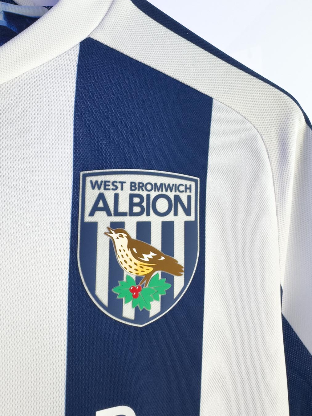 L’omaggio allo stadio è già visibile all’interno del collo dove è stampata l’immagine delle tribune dell’impianto di West Bromwich. Sul fondo maglia, a sinistra, è inoltre presente una particolare patch con la forma del The Hawthorns e all’interno un tordo, simbolo del club, e la scritta ‘125 Years’ in rosso su sfondo blu composto da biancospini (fiori che ricoprivano l’area dove lo stadio fu edificato).