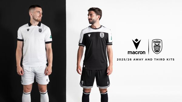 Nero e bianco si alternano nei nuovi kit Away e Third 2025/26 del PAOK FC realizzati da Macron