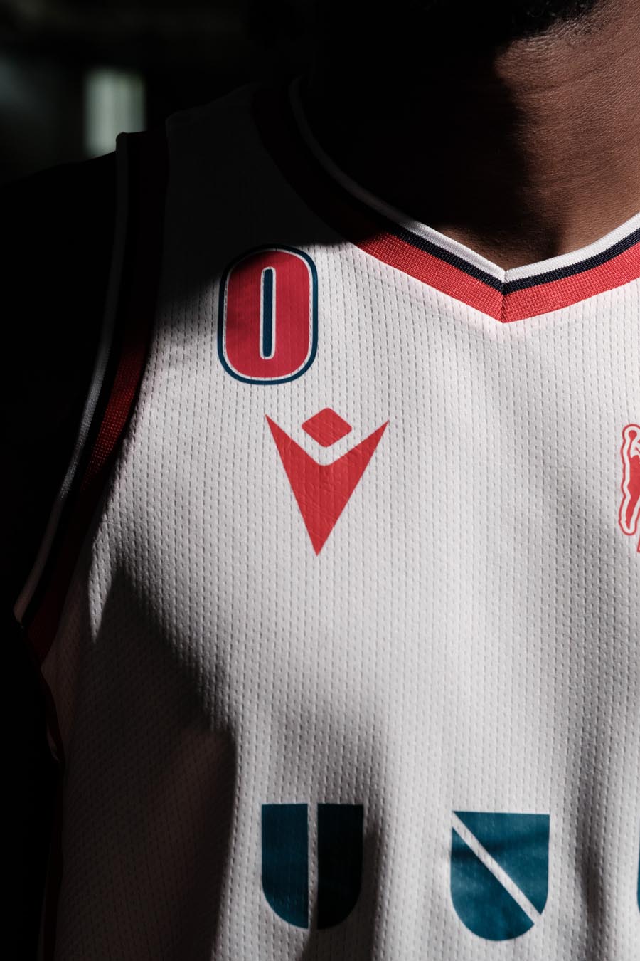 La nuova Home 2025/26 della Pallacanestro Reggiana è bianca con collo a V con bordo rosso e sottile linea blu navy, stesso abbinamento cromatico presente sugli sbracci. Sui fianchi è presente un’ampia banda verticale in blu navy delimitata da due sottili linee rosse. All’interno della banda è stampato, in rosso e in forma ripetuta, il logo del club. Sul petto, entrambi in rosso, a destra il Macron Hero, a sinistra lo stemma del club. Il backneck è personalizzato con etichetta rossa con il logo della Pallacanestro Reggiana, il logo Macron e la scritta ‘Designed in Bologna’, a certificare ed evidenziare come ogni capo sia ideato, progettato e sviluppato nel Macron Campus. I pantaloncini bianchi hanno il bordo superiore rosso con fine riga blu navy. Questi due colori sono presenti anche nelle bande diagonali sui fianchi e sul bordo coscia posteriore.