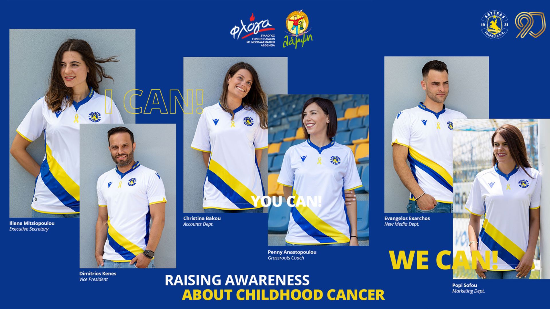 Στηρίζουμε την μαχη κατά του παιδικοÏ καρκινου * ΜΠΟΡΩ! ΜΠΟΡΕΙΣ! ΜΠΟΡΟΥΜΕ! (Sosteniamo la lotta contro il cancro infantile. SI PUÒ! TU PUOI! NOI POSSIAMO!). Sul petto, a destra, in blu è ricamato il Macron Hero, logo del brand italiano, a sinistra, lato cuore, lo stemma dell’Asteras Tripolis FC.