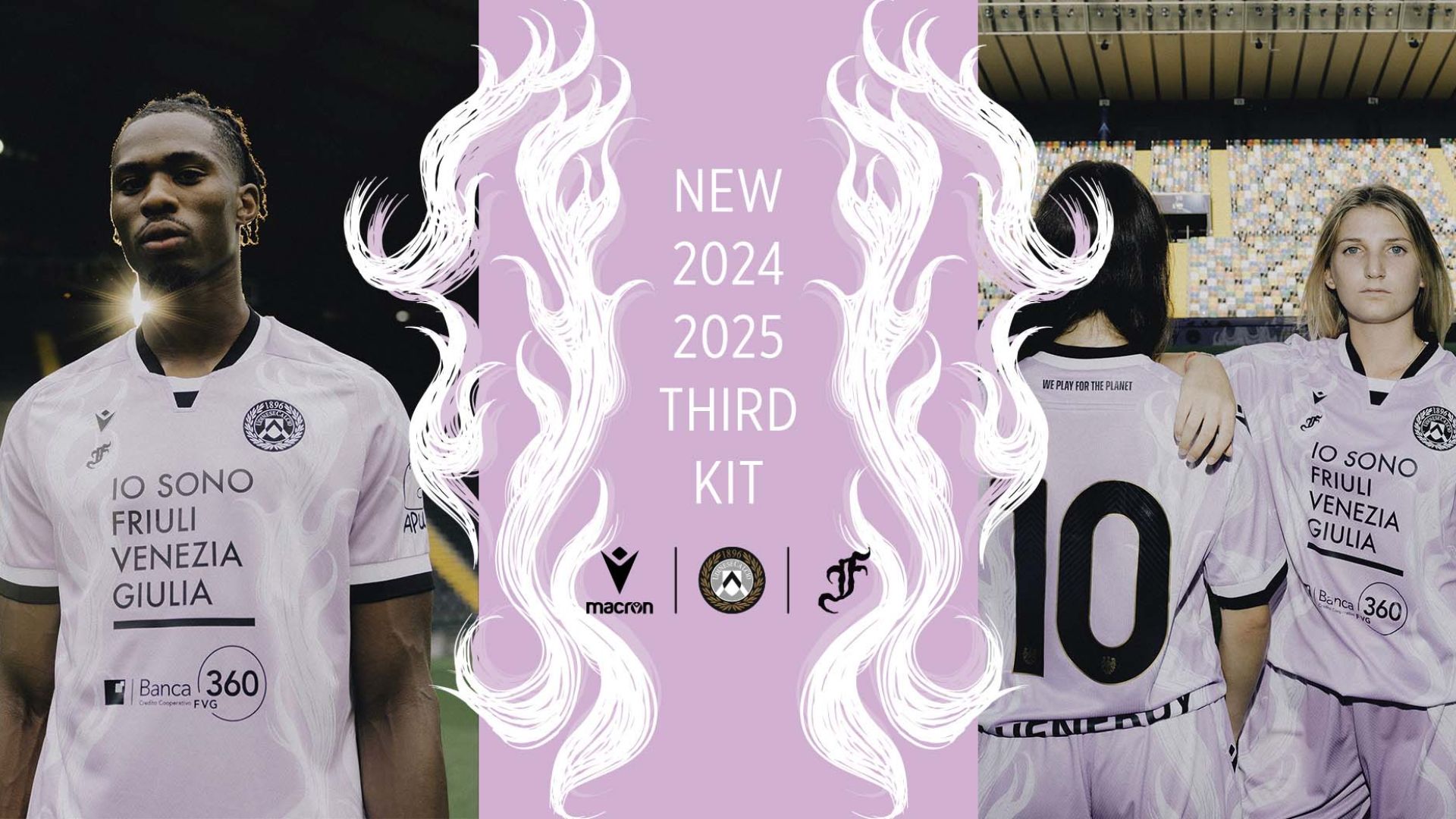 La nuova maglia Third 2024/25 dell’Udinese Calcio ha il collo alla coreana in maglieria con bordi bianconeri, abbinamento cromatico presente sui bordi manica. La maglia è di una particolare tonalità color glicine chiaro ed è caratterizzata da un pattern in grafica sublimata che riproduce il disegno irregolare di fiamme bianche che l’avvolgono sia anteriormente che posteriormente, sviluppandosi in particolare sui fianchi e sulle maniche. Il riferimento è ai raggi del Sole, elemento simbolico particolarmente significativo per la città di Udine e che in questo caso assume anche una valenza rafforzativa del messaggio di sostenibilità di cui questo kit si fa portatore. Proprio l’energia solare è protagonista dei lavori di ammodernamento a cui è stato sottoposto il Bluenergy Stadium, lo stadio in cui l’Udinese gioca i propri match casalinghi. Oltre 2.400 pannelli solari di ultima generazione consentiranno infatti una parziale autosufficienza energetica, rendendolo uno degli stadi più evoluti in Europa in termini di produzione di energia pulita.