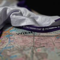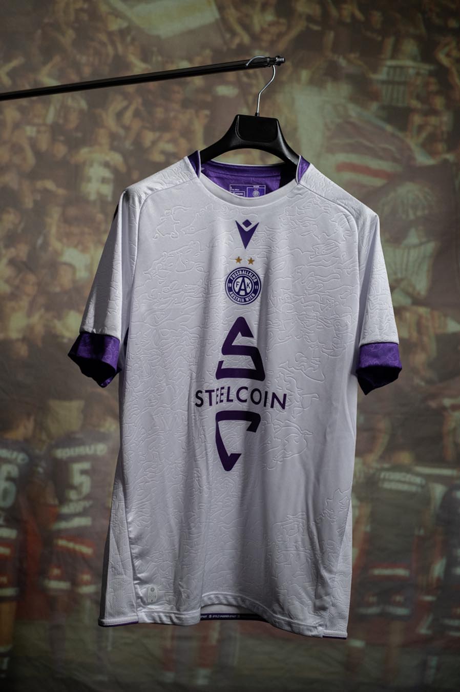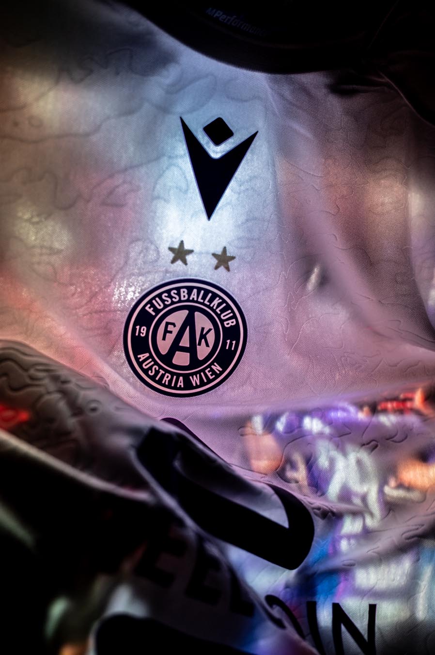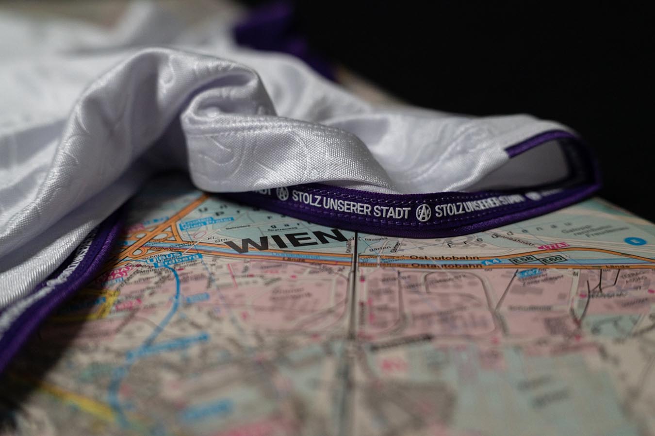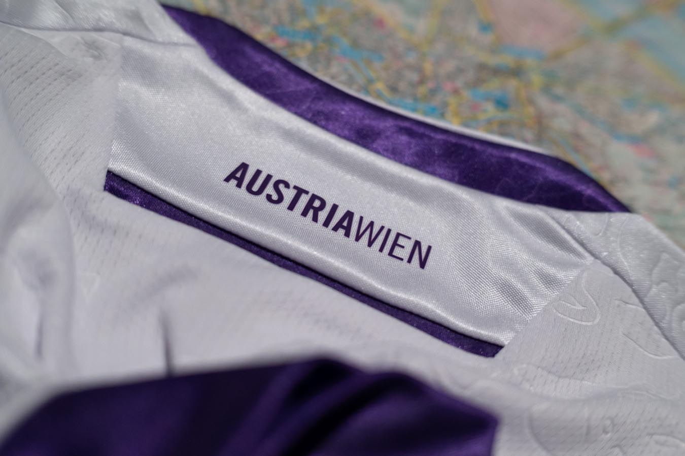 Nel retrocollo esterno, in viola, è inserita la scritta AUSTRIAWIEN, mentre anteriormente, sul fondo maglia, è inserito un tape interno personalizzato con la scritta STOLZ UNSERER STADT (Orgoglio della nostra città), ripetuto e intervallato dallo stemma del club. L’etichetta nel backneck interno è personalizzata con sfondo che riprende la grafica della maglia Home, il logo del club sopra il quale appare la scritta VEILCHEN, il logo Macron e la scritta ‘Designed in Bologna’ che certifica come ogni capo sia ideato, progettato e sviluppato al Macron Campus.
