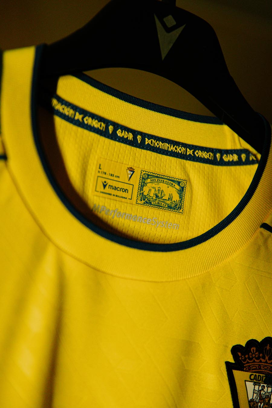 Il backneck è personalizzato con etichetta caratterizzata dal disegno in blu di un francobollo che rappresenta alcuni vascelli e la scritta latina NON PLUS ULTRA. Si tratta di un riferimento al fatto che Cadice, punto più occidentale dell’Impero Romano, fosse considerato uno dei limiti del mondo conosciuto, oltre che diventare successivamente il punto di partenza per molte esplorazioni e viaggi nel Nuovo Mondo. Insieme al francobollo appare il logo del club, il logo Macron e la scritta Designed in Bologna, a certificare ed evidenziare come ogni capo sia ideato, progettato e sviluppato presso il Macron Campus. Sempre all’interno del girocollo è presente un tape personalizzato con la scritta, intervallata dallo stemma della squadra, DENOMINACIÓN DE ORIGEN e GADIR, parola quest’ultima di origine fenicia che significa castello, fortezza e dal quale deriva l’attuale nome della città.
