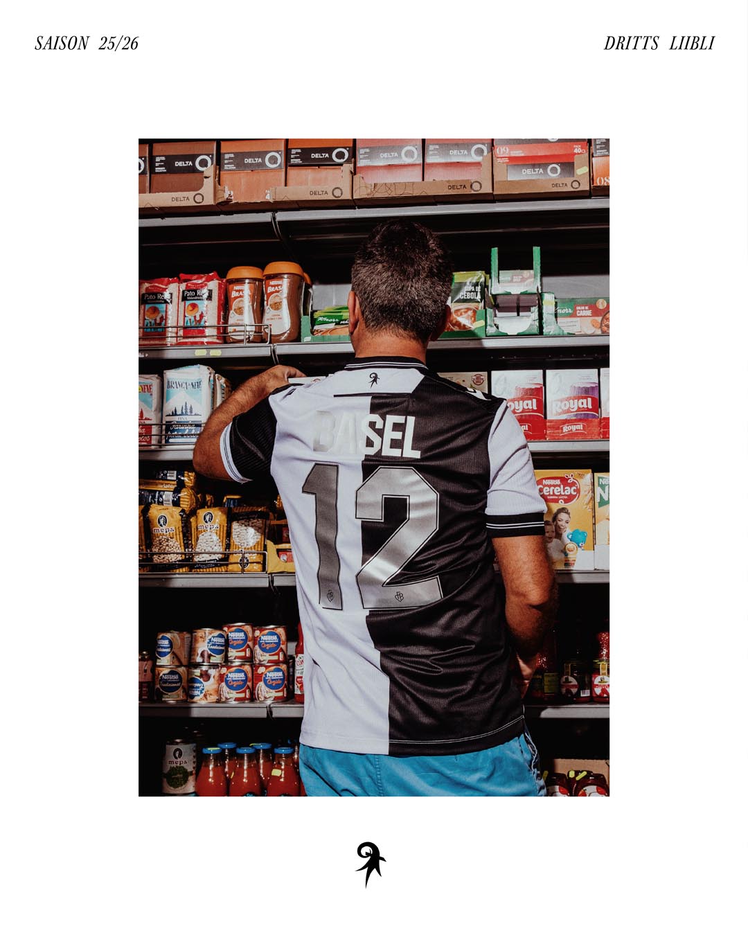 Il design del kit, suddiviso in due metà bianca e nera, è un richiamo ai colori della bandiera cittadina, ma anche nello specifico ad una delle maschere tradizionali del Carnevale di Basilea: Ueli, un personaggio che ricorda un giullare e che indossa per l’appunto abiti suddivisi tra bianco e nero. Il tutto è inoltre arricchito dall’utilizzo del tessuto Eco Checker Jaquard, composto da una griglia di piccoli quadrati direttamente inseriti nella trama del tessuto, creando effetti leggermente in rilievo ed esaltando la qualità della manifattura.