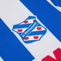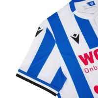 La maglia Home 2025/26 dell’SC Heerenveen ha il collo alla coreana con bordi biancoblù, mentre i bordi manica sono caratterizzati da tre righe orizzontali blu, bianca e nera. La maglia si presenta con le tradizionali strisce verticali bianche e blu. Nelle parti bianche sono inseriti, in grafica sublimatica, gli iconici pompeblêd, caratteristico simbolo presente nello stemma del club oltre che nella bandiera della Frisia, che rappresenta in rosso i petali delle ninfee.