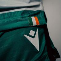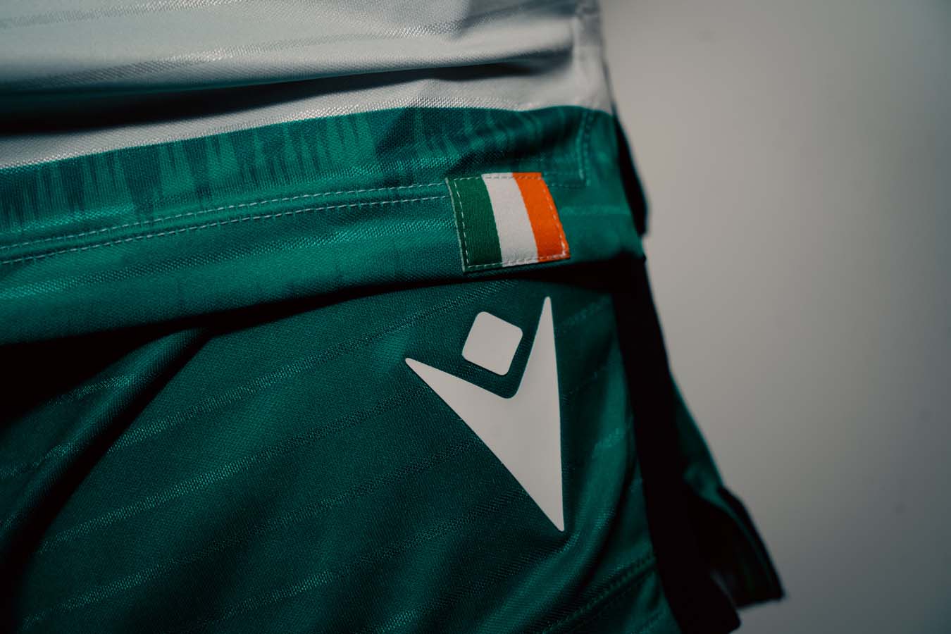 Il collo a polo, una scelta stilistica elegante e fortemente identitaria, è nero ed è realizzato in maglieria, così come i bordi manica, creando un contrasto netto e deciso che valorizza le tonalità del corpo maglia. Sul petto, il Macron Hero è applicato in silicone nero, mentre lo stemma dello Shamrock Rovers FC, in una particolare versione su sfondo nero per farlo risaltare ulteriormente sulla banda bianca del kit, è posizionato sul cuore, riprodotto con elevata definizione grazie alla patch in silicone multistrato. Sul fondo della maglia è inoltre applicata un’etichetta tessuta con il tricolore irlandese.