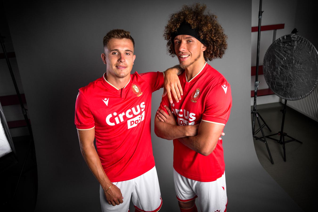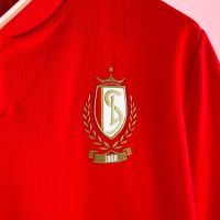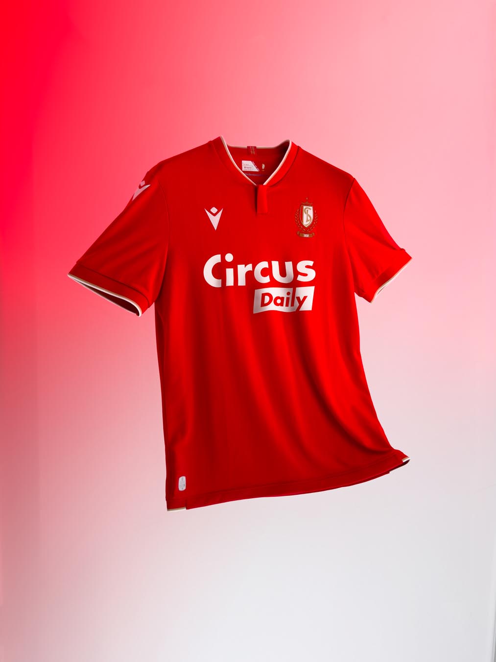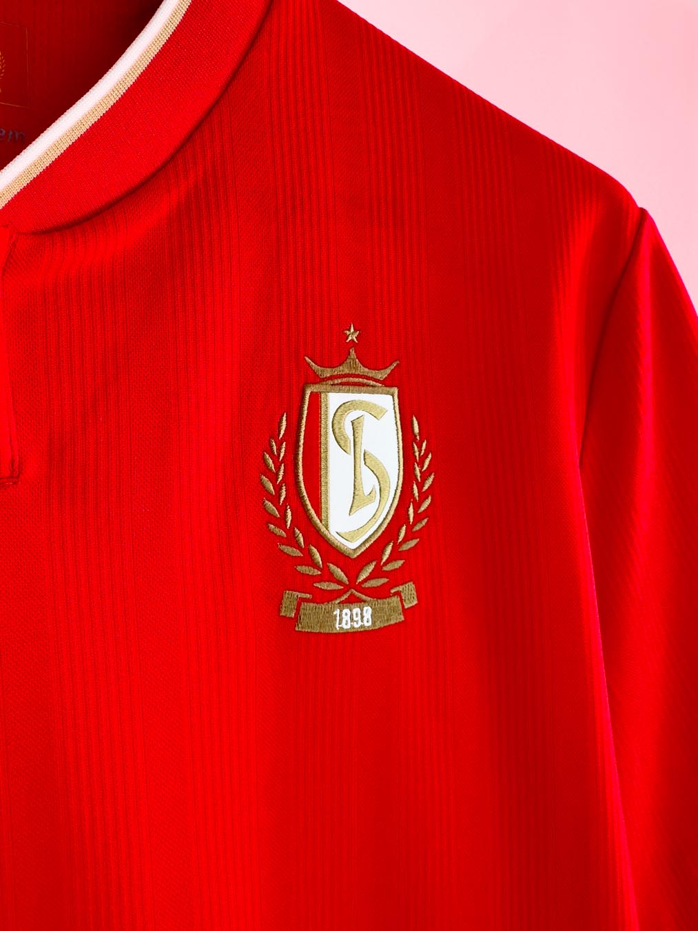 Sul bordo esterno posteriore del colletto è presente una stella dorata a significare i 10 campionati belgi vinti. Nel retrocollo esterno ritornano in bianco le parole PASSION, FIERTÉ, FERVEUR che rappresentano il DNA di questa squadra e dei suoi tifosi, capaci di ‘infiammare’ gli spalti dello Sclessin ad ogni gara. Un altro dettaglio che esprime identità e senso di appartenenza ai colori del club è nel tape siliconato interno, inserito nel fondo maglia posteriore e personalizzato con la scritta, ripetuta e in rosso su fondo dorato, ROUCHES DEPUIS 1898. Il game set casalingo è completato da pantaloncini bianchi con coulisse rosse e bande rosse con fine riga dorata sul bordo coscia, insieme ai calzettoni rossi con riga bianca e dorata sul bordo superiore.