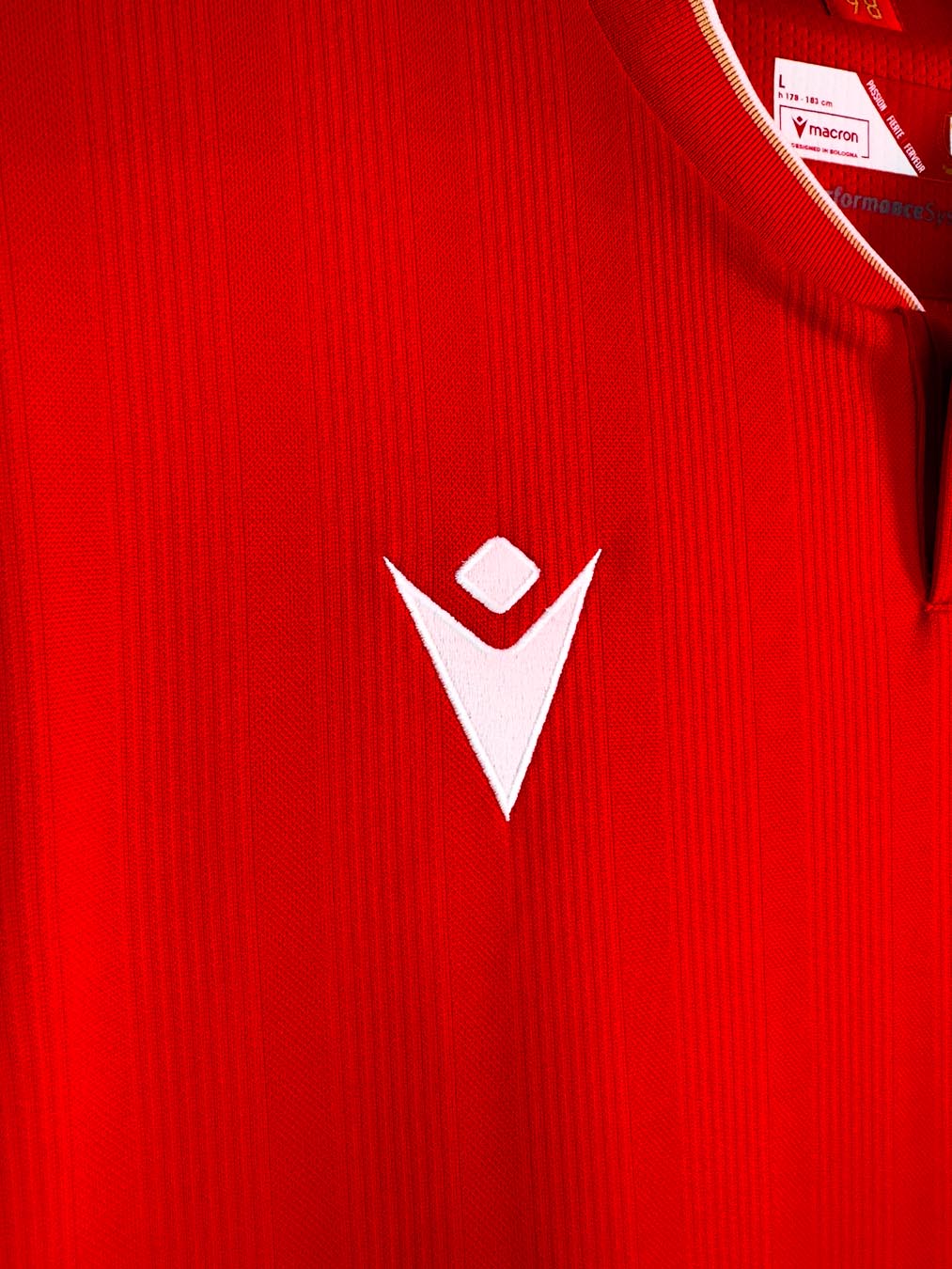 La nuova Home 25-25 dello Standard de Liège è rossa con collo alla coreana in maglieria con chiusura a due bottoni e arricchito da fini ed eleganti righe bianche e dorate, abbinamento cromatico presente anche sui bordi manica. La maglia è caratterizzata, nella parte anteriore, sulle spalle e sulle maniche, da una fine trama jacquard che compone un elegante effetto gessato. Il backneck è personalizzato con etichetta bicolore, bianco e rosso, con il logo del club e le parole del motto dello Standard, PASSION, FIERTÉ, FERVEUR, insieme al logo Macron e alla scritta ‘Designed in Bologna’, a certificare ed evidenziare come ogni capo sia ideato, progettato e sviluppato nel Macron Campus. Sul bordo interno del colletto è stampato in oro l’anno di fondazione del club, 1898. Sul petto, a destra e in bianco, il Macron Hero, a sinistra è ricamata la patch con lo stemma dello Standard de Liège.