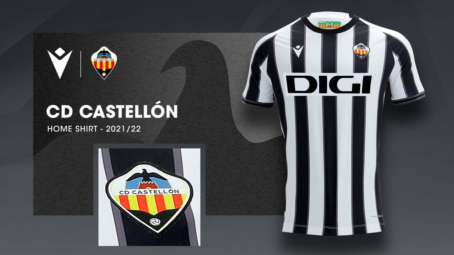 La “Home” è nella tradizionale configurazione a bande verticali bianconere. La maglia è a girocollo con bordi neri in maglieria, come neri sono i bordi manica. Il backneck è personalizzato con i colori e lo stemma del club. Sul petto, a destra, è ricamato in bianco il Macron Hero, logo del brand italiano, a sinistra, lato cuore, la patch con lo stemma del CD Castellon.