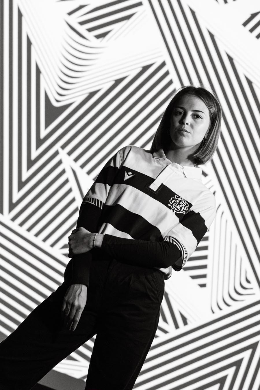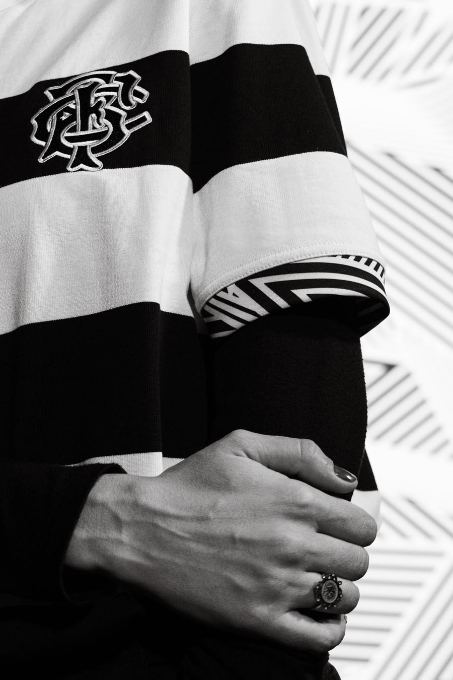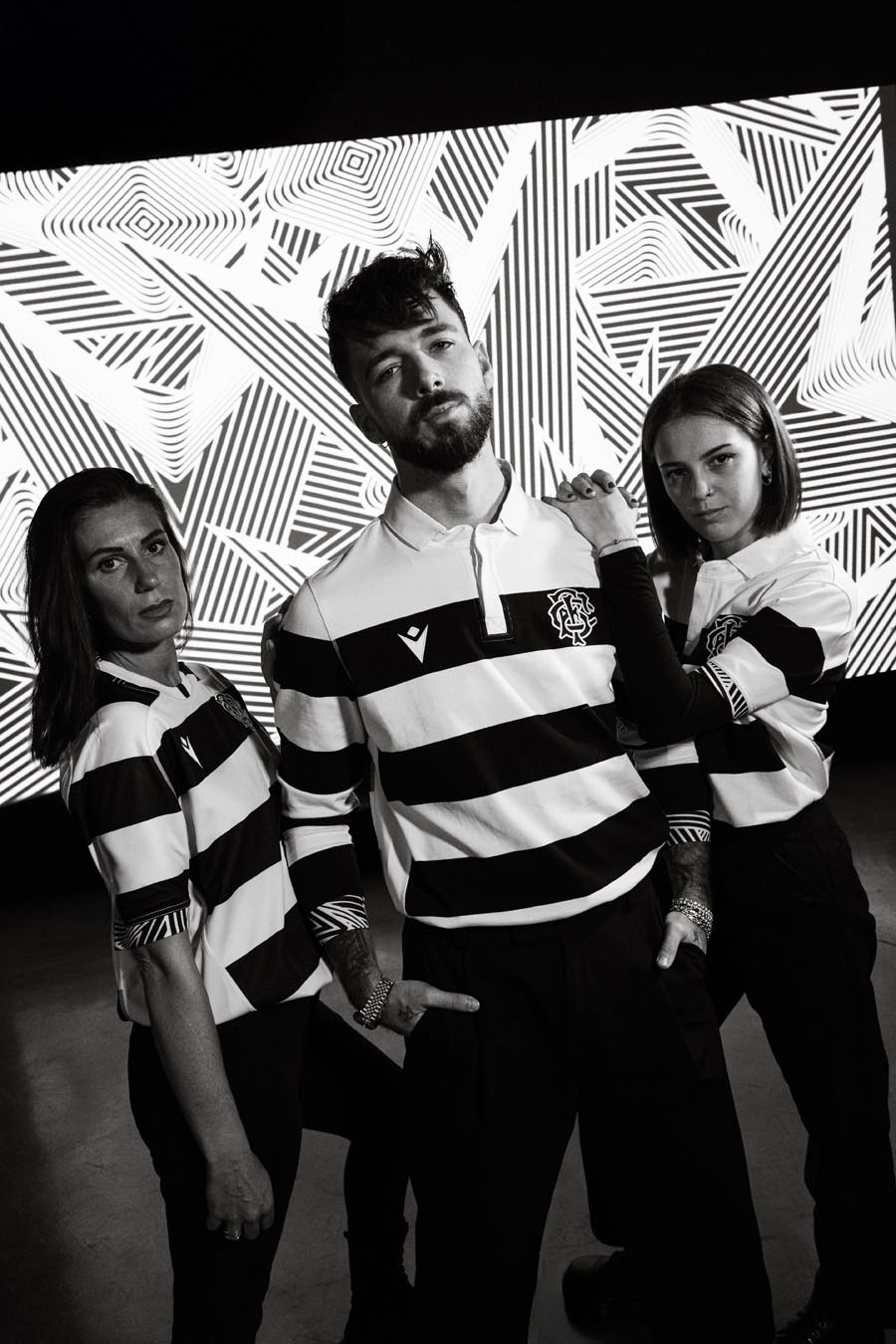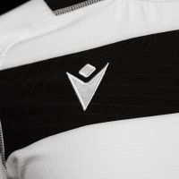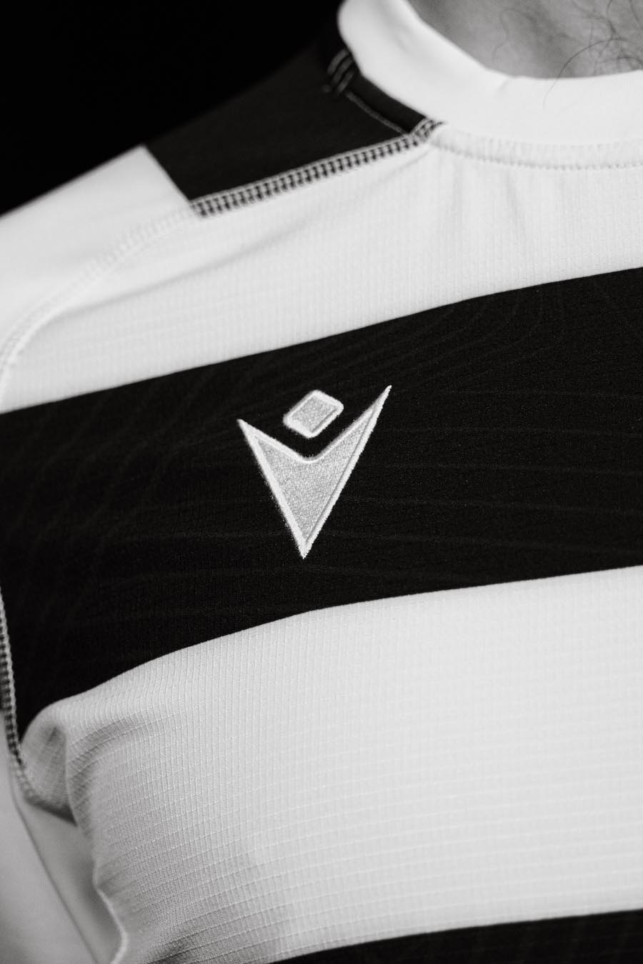 Il nuovo Game Set non si discosta dalle tradizionali e iconiche bande orizzontali bianche e nere, con quest’ultime che però sono caratterizzate in questo caso dalla presenza di una grafica geometrica tono su tono. Lo stesso pattern, ricavato dalla moltiplicazione e intersezione delle curve e degli angoli formati dal Macron Hero, logo del brand italiano, è presente in versione alternata bianco-nera anche nel girocollo e sui bordi manica. Nel retrocollo esterno, insieme al logo del club, sono stampate in nero su fondo bianco quattro parole che riconducono a quattro valori chiave per il club, ovvero FLAIR – COURAGE – SPIRIT – PASSION. L’interno del backneck è personalizzato con etichetta a sfondo nero che riprende la grafica della maglia, il logo del Barbarian FC, il logo Macron e la scritta Designed in Bologna, a certificare ed evidenziare come ogni capo sia ideato, progettato e sviluppato presso il Macron Campus. Sul petto sono ricamati a destra il Macron Hero e a sinistra lo stemma del club. Il kit è completato da pantaloncini neri, mentre, come da tradizione, i calzettoni saranno di libera scelta per i giocatori selezionati, i quali potranno decidere di indossare quelli del proprio club di appartenenza, di quello in cui sono cresciuti o della propria nazionale.