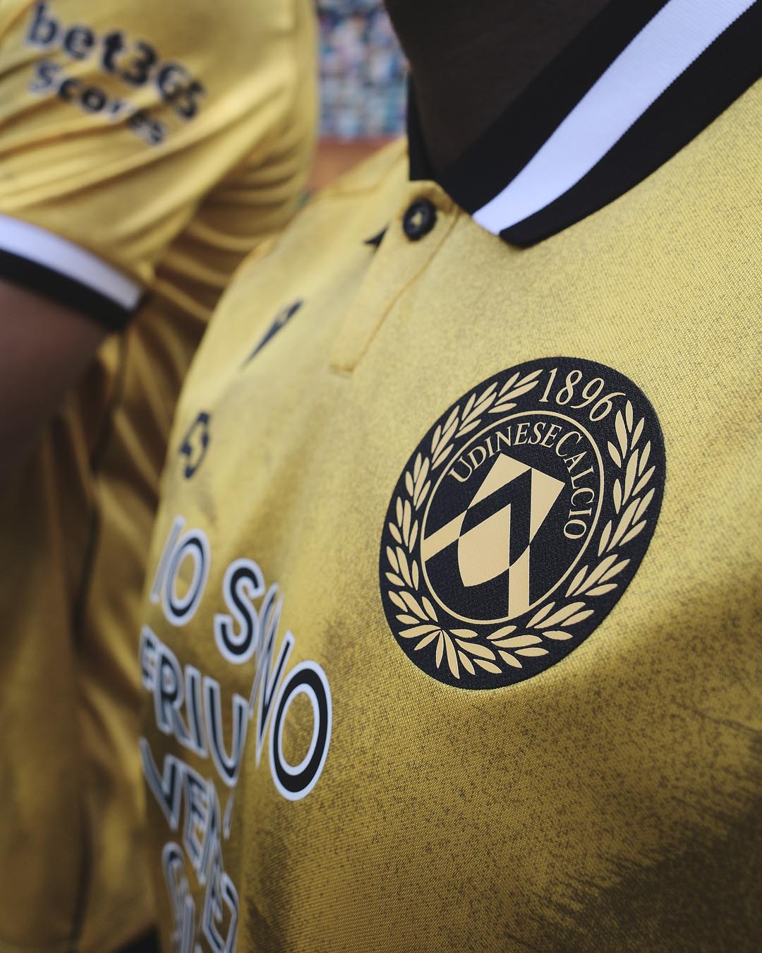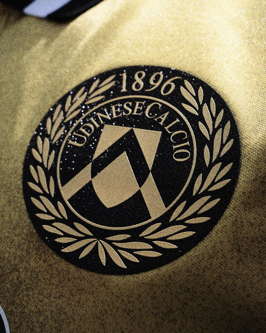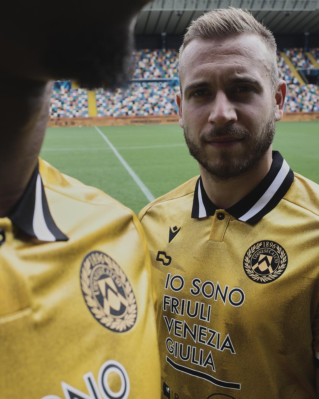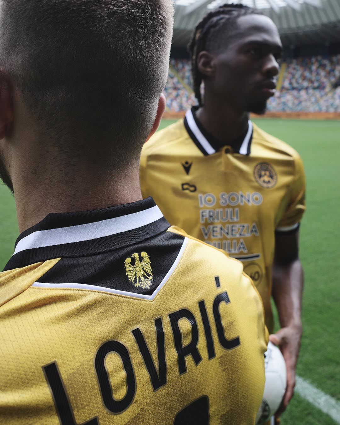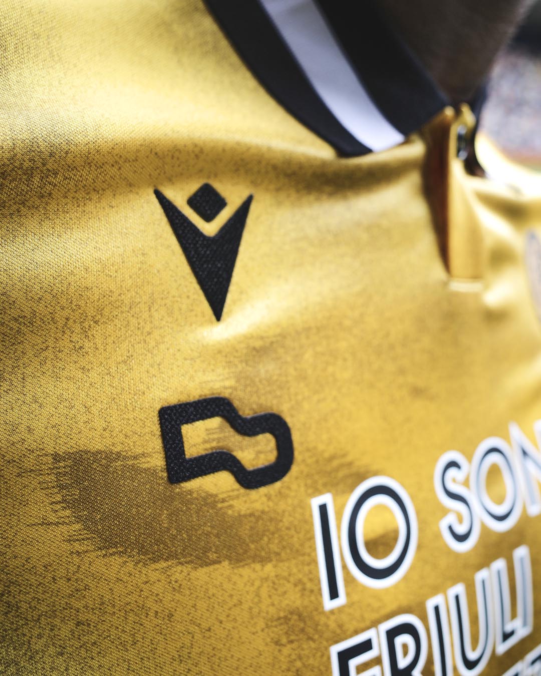 La nuova maglia Third dell’Udinese Calcio ha il collo a polo in maglieria bianconero, abbinamento cromatico presente anche sui bordi manica. La maglia è di una particolare tonalità color giallo-oro e presenta sul fronte e sul retro l’aquila in versione stilizzata, uno dei simboli storici più importanti di Udine e dell’intero Friuli, con radici profonde nella storia medievale e nell’identità culturale friulana. Sul petto a destra e uno sotto l’altro, spiccano il Macron Hero e il logo di Domenico Orefice, intersezione delle sue iniziali stilizzate e simbolo di movimento. A sinistra è applicato invece lo stemma dell’Udinese Calcio. Il backneck è personalizzato con etichetta che riprende il colore e la grafica della maglia e all’interno della quale sono presenti i loghi di Udinese Calcio, il logo del brand Domenico Orefice, la scritta “I PRIMI BIANCONERI D’ITALIA”, il logo Macron e la dicitura “Designed in Bologna” che certifica ed evidenzia come ogni capo sia ideato, progettato e sviluppato all’interno del Macron Campus in Valsamoggia.