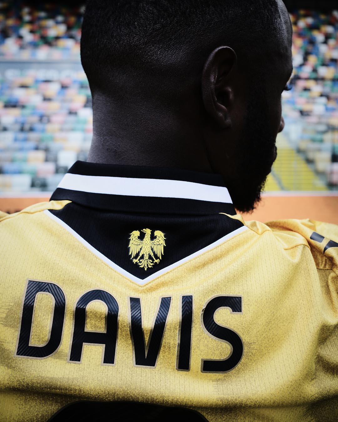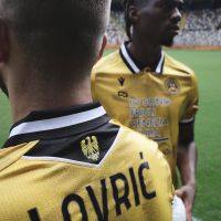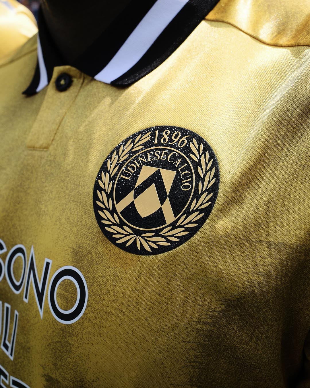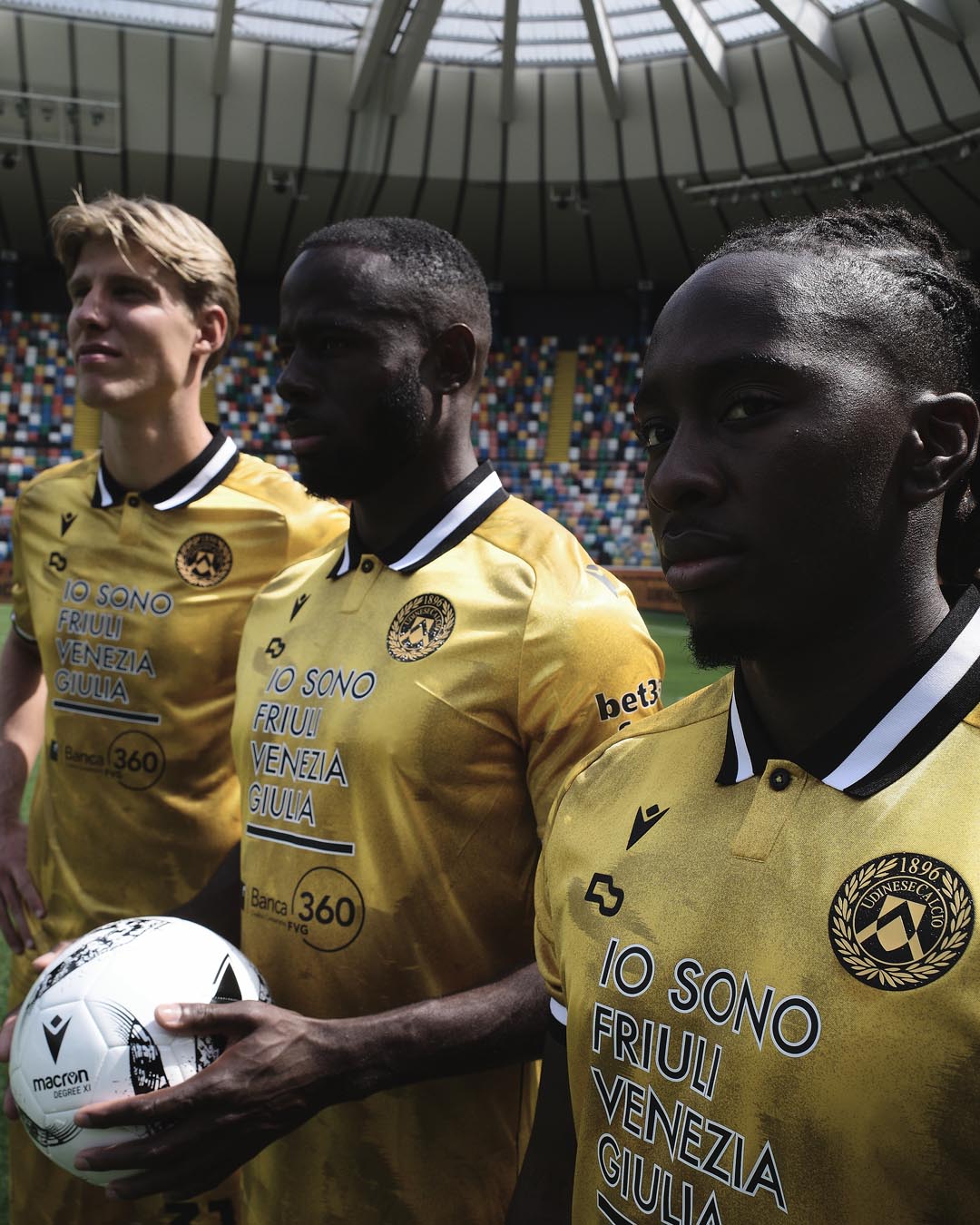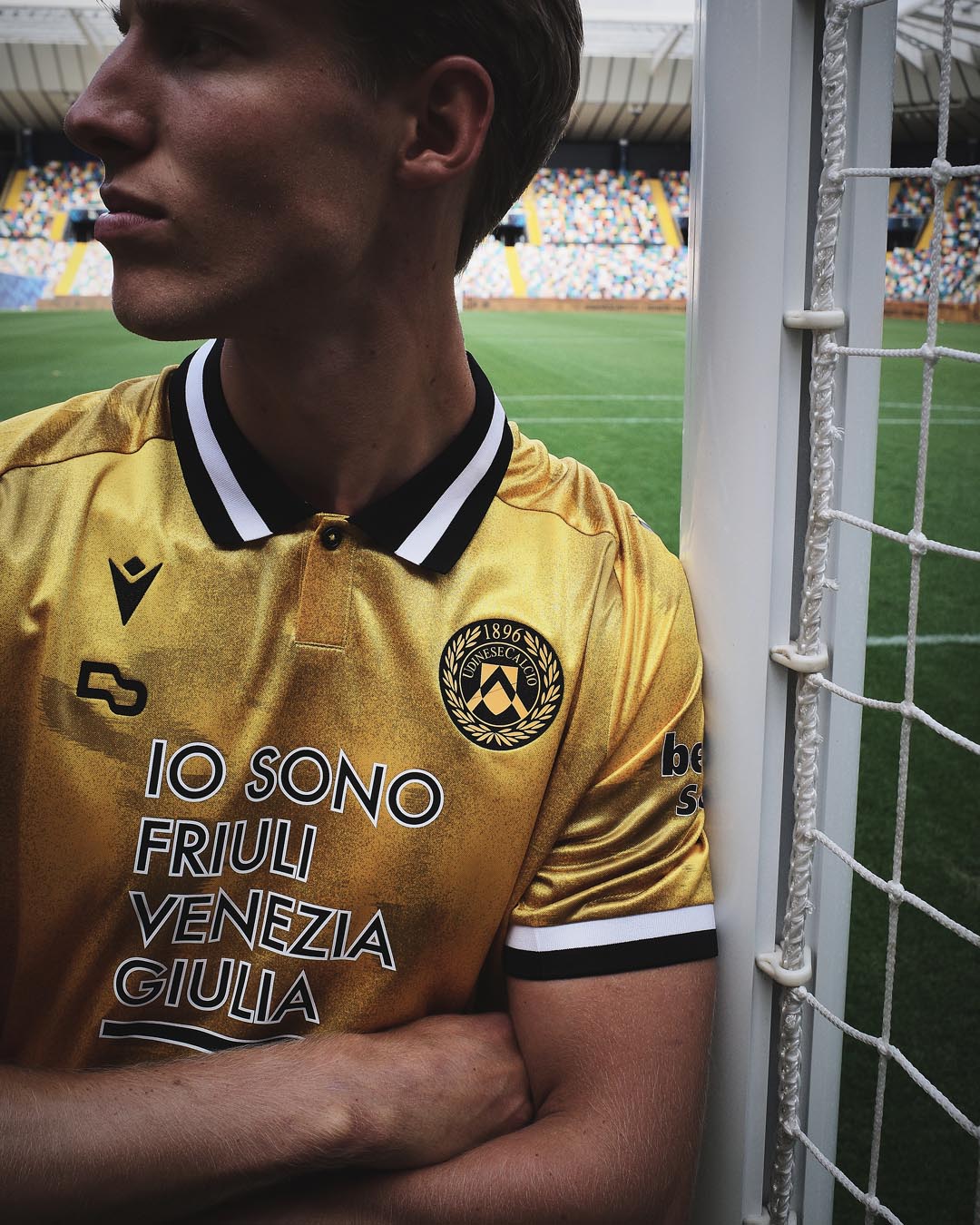 La nuova maglia Third dell’Udinese Calcio ha il collo a polo in maglieria bianconero, abbinamento cromatico presente anche sui bordi manica. La maglia è di una particolare tonalità color giallo-oro e presenta sul fronte e sul retro l’aquila in versione stilizzata, uno dei simboli storici più importanti di Udine e dell’intero Friuli, con radici profonde nella storia medievale e nell’identità culturale friulana. Sul petto a destra e uno sotto l’altro, spiccano il Macron Hero e il logo di Domenico Orefice, intersezione delle sue iniziali stilizzate e simbolo di movimento. A sinistra è applicato invece lo stemma dell’Udinese Calcio. Il backneck è personalizzato con etichetta che riprende il colore e la grafica della maglia e all’interno della quale sono presenti i loghi di Udinese Calcio, il logo del brand Domenico Orefice, la scritta “I PRIMI BIANCONERI D’ITALIA”, il logo Macron e la dicitura “Designed in Bologna” che certifica ed evidenzia come ogni capo sia ideato, progettato e sviluppato all’interno del Macron Campus in Valsamoggia.