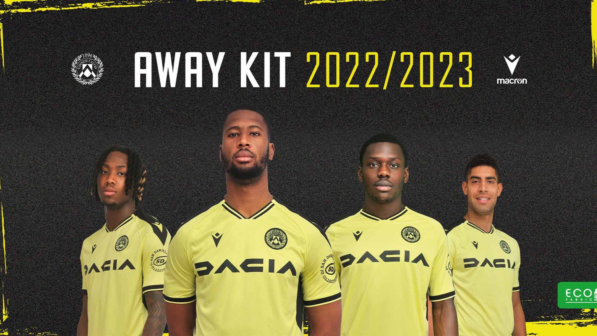La nuova ‘Away’ è gialla con dettagli neri intorno ai bordi del colletto a V, sulle spalle e sui bordi manica. Il backneck è personalizzato con il logo dell’Udinese Calcio e con la frase I PRIMI BIANCONERI D’ITALIA, mentre nel retrocollo è ricamato in nero un altro motto del club: La Passione è la nostra Forza. Sul petto, a destra, è ricamato in nero il Macron Hero, logo del brand italiano, a sinistra, lato cuore è applicata la patch con lo stemma dell’Udinese Calcio.