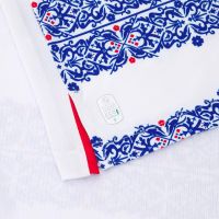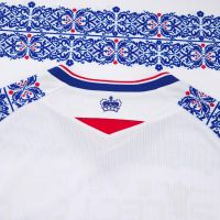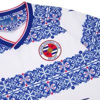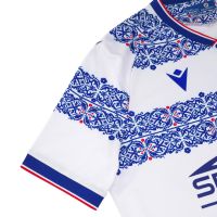 La nuova maglia Home 25-26 del Reading FC si presenta con la tradizionale configurazione a bande orizzontali bianche e blu. Proprio queste ultime sono però caratterizzate da un elaborato disegno, realizzato in stampa sublimatica. Il particolare pattern blu con dettagli rossi è infatti ispirato alle decorazioni ornamentali che erano presenti sulle famose scatole di latta dei biscotti Huntley & Palmers, che nel 1900 raggiungevano ogni parte del mondo, dall’Africa al Tibet fino al Polo Sud. La maglia ha il collo a V con bordi rosso-bianco-blu, così come i polsi delle maniche. Sul petto, a destra, in stampa siliconata blu, è applicato il Macron Hero, mentre a sinistra è presente lo stemma del Reading FC, realizzato in stampa siliconata su base con effetto scamosciato.
