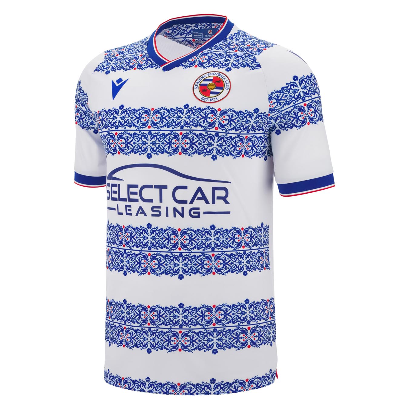 Il backneck è personalizzato con un’etichetta con sfondo blu con all’interno, tono su tono, il disegno delle decorazioni grafiche presenti sulla maglia. L’etichetta è completata dallo stemma del club con la scritta READING FC 1871, il logo Macron e dalla scritta ‘Designed in Bologna’, a certificare ed evidenziare come ogni capo sia ideato, progettato e sviluppato nel Macron Campus. Nel retrocollo esterno è stampato in blu il disegno della corona, presente nello stemma del club insieme al leone. I pantaloncini sono blu con bande bianche laterali, i calzettoni blu hanno una banda bianca con sottile linea rossa nel bordo superiore.