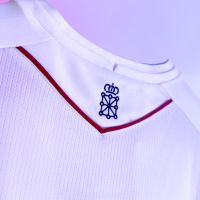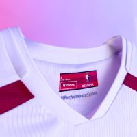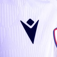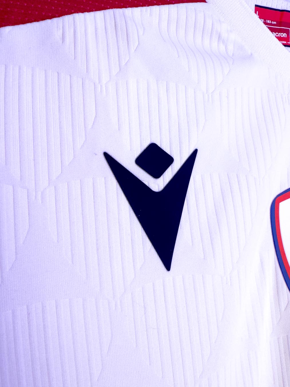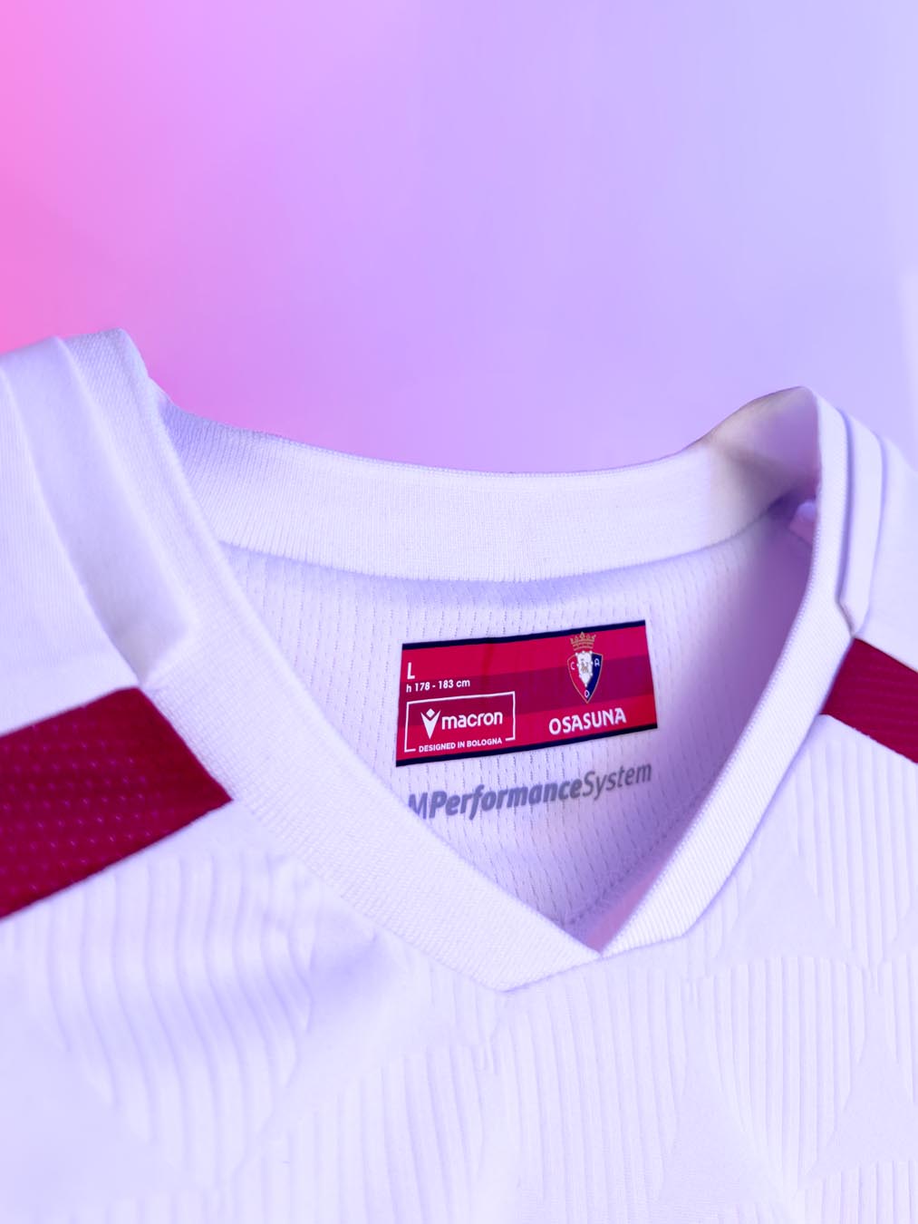 L’etichetta nel backneck è identica a quella presente nelle versioni Home e Away, con tre bande orizzontali in due toni di rosso distinto, la scritta OSASUNA, il logo Macron e la scritta ‘Designed in Bologna’ che certifica come ogni capo sia ideato, progettato e sviluppato presso il Macron Campus. Nel retrocollo esterno è ricamato in blu scuro lo stemma della Comunità Autonoma della Navarra.