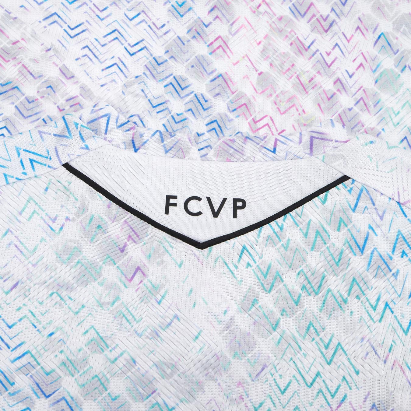 Sul petto, il Macron Hero è applicato sulla destra, mentre a sinistra è presente il logo, in versione monocromatica, dell’FC Viktoria Plzeň. Nel retrocollo esterno, in nero, è stampato l’acronimo FCVP. I pantaloncini bianchi sui fianchi hanno bande che riprendono la grafica geometrica della maglia. I calzettoni sono completamente bianchi.