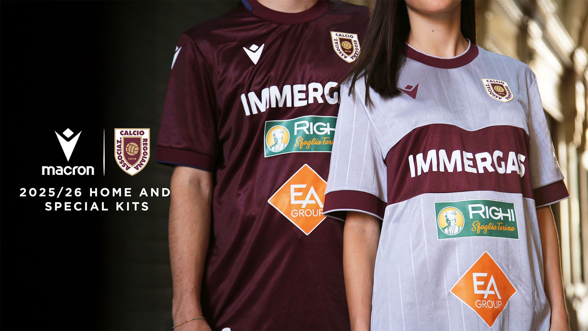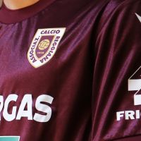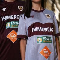 La versione Special 2025/26 è grigia con girocollo e bordi manica granata, come granata è l’ampia banda orizzontale all’altezza del petto. Realizzata anch’essa in tessuto Eco Everton, che le conferisce un’estetica vintage, la maglia è inoltre caratterizzata da un fine rigato verticale in grafica embossata, creando un elegante effetto gessato. Nella cucitura laterale destra, appena sopra al fondo maglia, è inserito un dettaglio tricolore, con tre bartack (cuciture rinforzate) verde, bianco e rosso a rendere omaggio alla Città del Tricolore. Il Macron Hero sul petto è in stampa siliconata granata. La scritta Reggiana nel retrocollo esterno è anch’essa color granata. Pantaloncini granata con coulisse e bordo coscia in grigio e calzettoni grigi con bordo superiore granata completano il kit. 70 anni fa, nella stagione 1955/56, la squadra capitanata da Aldo Catalani conquistò una storica promozione in serie C con numeri da record, cui seguì una ascesa che portò i granata in tre anni dalla IV serie alla Serie B sfiorando ripetutamente la conquista della massima categoria. È proprio in quel periodo, nella seconda metà degli anni ’50, che il Club guidato da Luigi del Grosso indossa una maglia Away alla quale si ispira questa della stagione 2025/26.