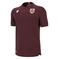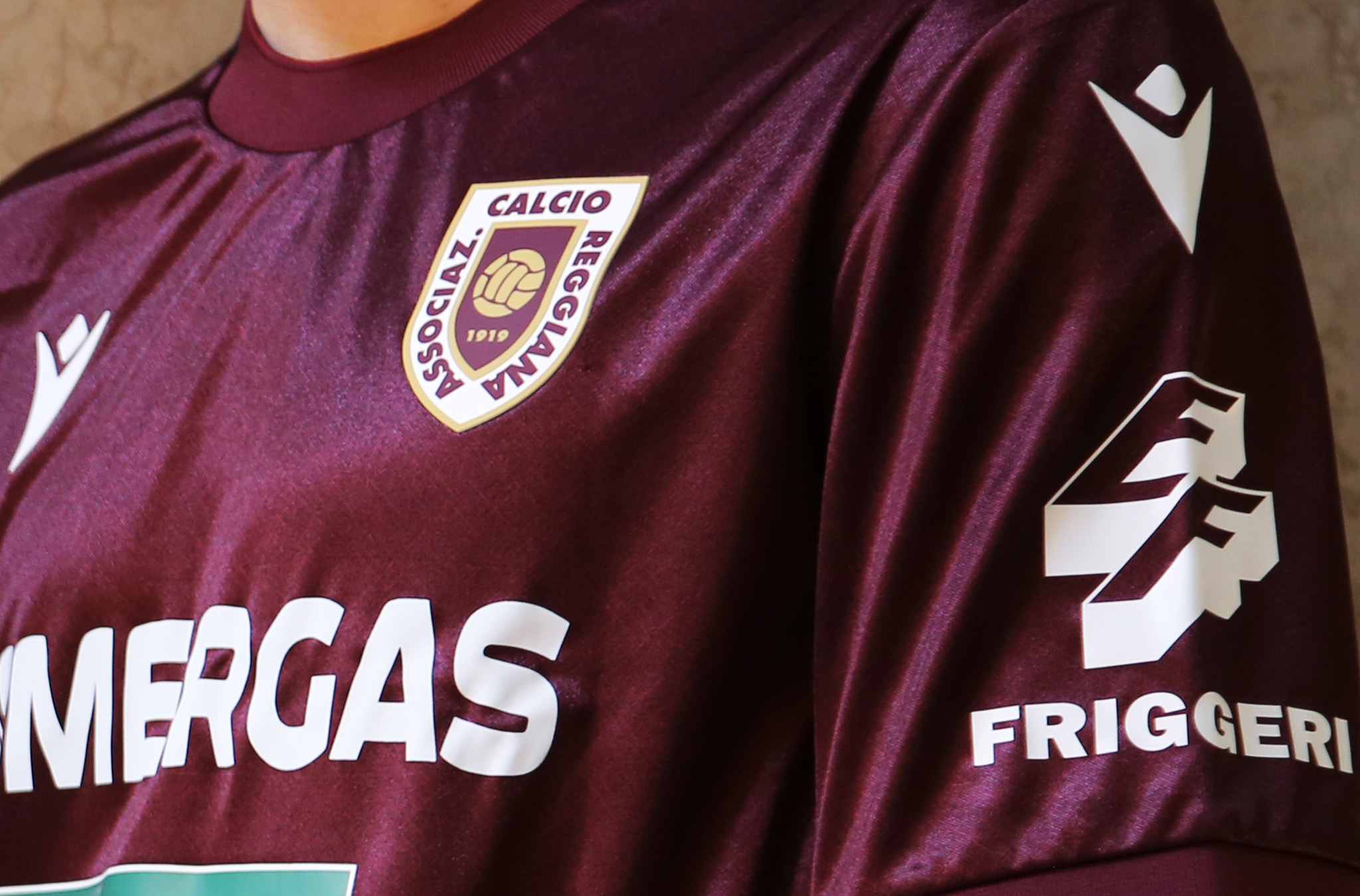 La maglia Home 2025/26 dell’AC Reggiana festeggia il centenario della divisa più classica della storia del club: maglia granata, pantaloncini blu, calzettoni neri. È, infatti, nella stagione 1925/26 che al granata della maglia si accostano i pantaloncini blu (in precedenza erano bianchi), colore che fino a quel momento aveva costituito un elemento della sola maglia. Il design è a girocollo con dettagli in blu navy. Il colore predominante, come da tradizione, è il classico e storico color granata, che però in questo caso viene arricchito da una texture grafica tono su tono presente sull’intero kit, la quale riproduce la trama superficiale tipica dei tessuti delle maglie d’epoca. Il tocco vintage è ulteriormente amplificato dal tessuto stesso utilizzato per questo kit, ovvero l’Eco Everton, il quale è in grado di riflettere la luce e creare effetti visivi che rievocano l’impatto estetico tipico dei kit old school. Sul petto, in stampa siliconata, a destra il Macron Hero in bianco, a sinistra lo stemma dell’AC Reggiana. Nella parte posteriore del girocollo è applicata una linguetta coi colori della bandiera italiana, riferimento a Reggio Emilia come Città del Tricolore. Poco più in basso, all’interno di un’area triangolare nel collo esterno delimitata da un piping blu navy, è applicata a caldo la scritta ‘Reggiana’ in bianco. I pantaloncini sono in blu navy con coulisse nere e bande laterali granata con dettagli bianchi. I calzettoni neri hanno il bordo superiore granata con sottile linea orizzontale bianca.